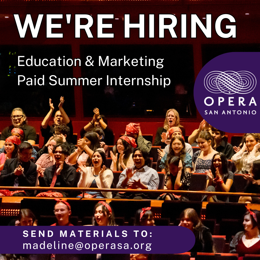 OPERA San Antonio is seeking a motivated intern to work closely with the Director of Education & Outreach in supporting a variety of programs throughout the summer. The intern will assist with developing educational resources, helping facilitate the Emerging Artists Voice Intensive, and supporting select marketing and community outreach initiatives. This role offers hands-on experience with professional artists and valuable insight into how a performing arts organization operates.